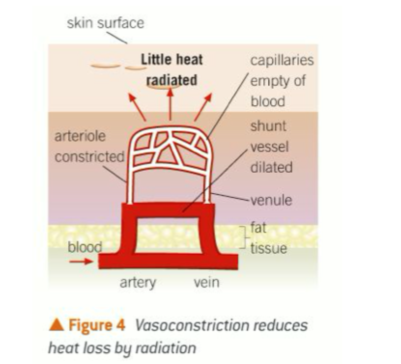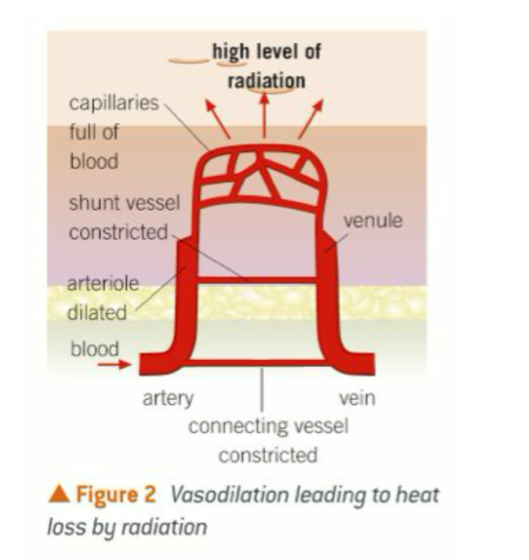 The arteriovenous shunt vessels dilate, so very little blood flows through the capillary networks close to the surface of the skin.