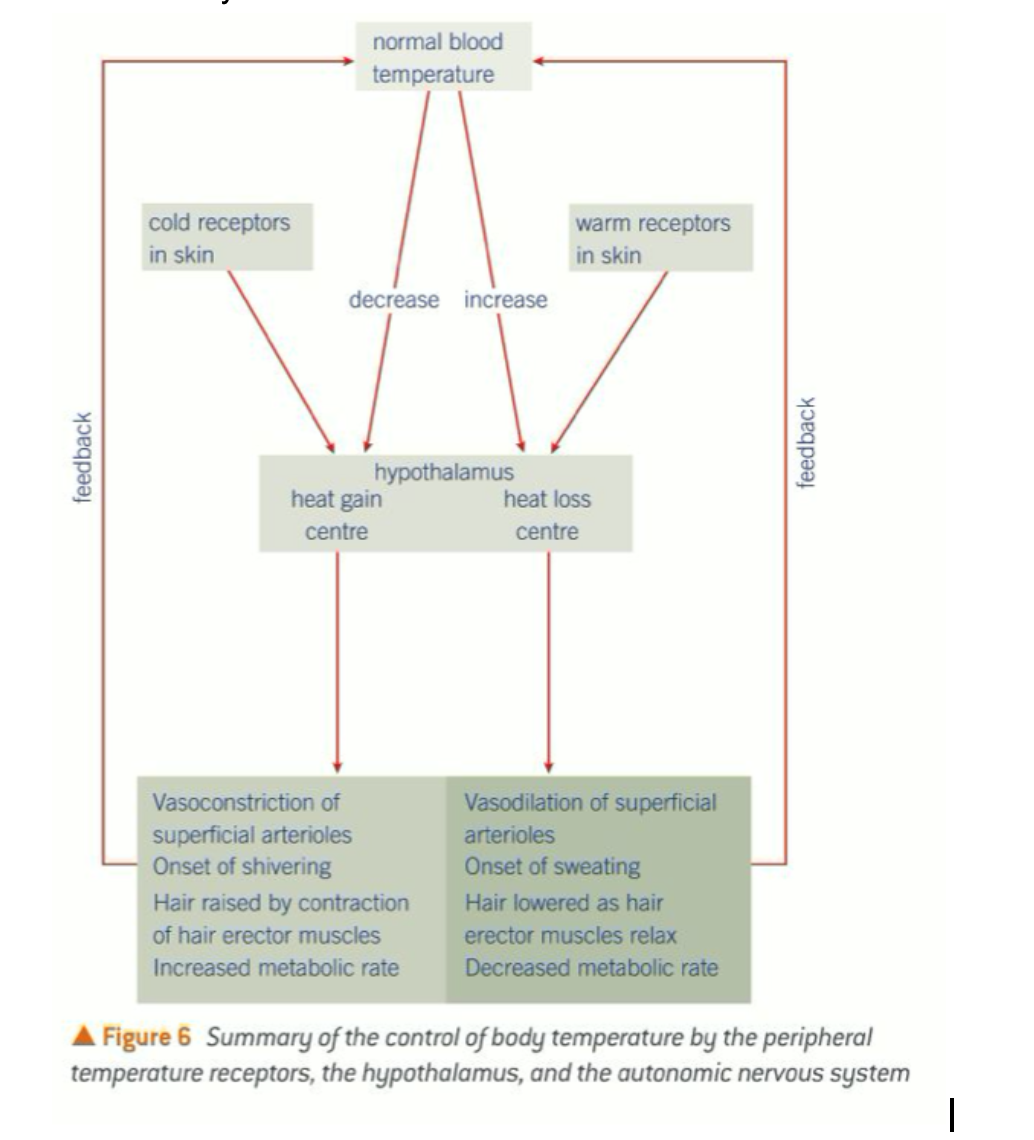 The physiological responses of endotherms to changes in the core temperature are the result of complex homeostatic mechanisms involving negative feedback control from the hypothalamus.