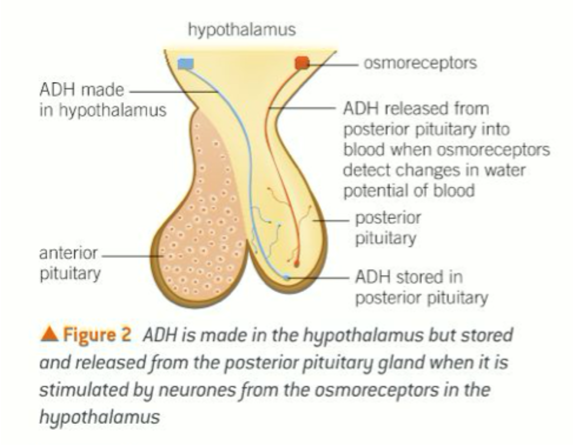 ADH is released from the pituitary gland and carried in the blood to the cells of the collecting duct where it has its effect.