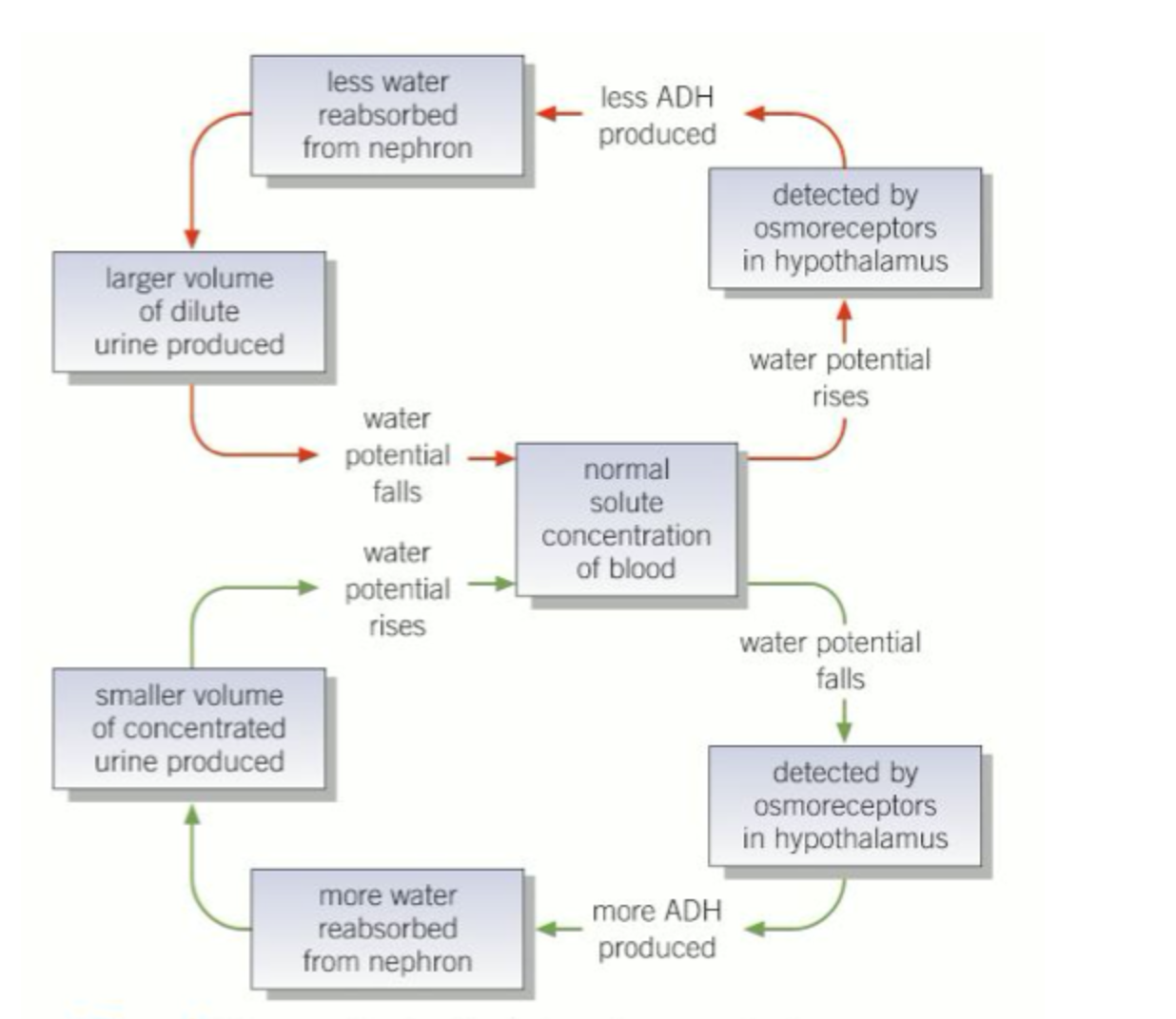 This is brought about by a complex negative feedback system that involves osmoreceptors in the hypothalamus of the brain.