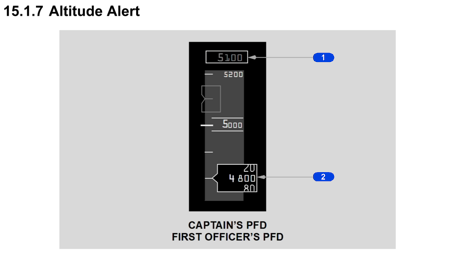 (1) Selected Altitude Alert – A white box shows around the selected altitude display between 750 feet and 200 feet before reaching the selected altitude.
