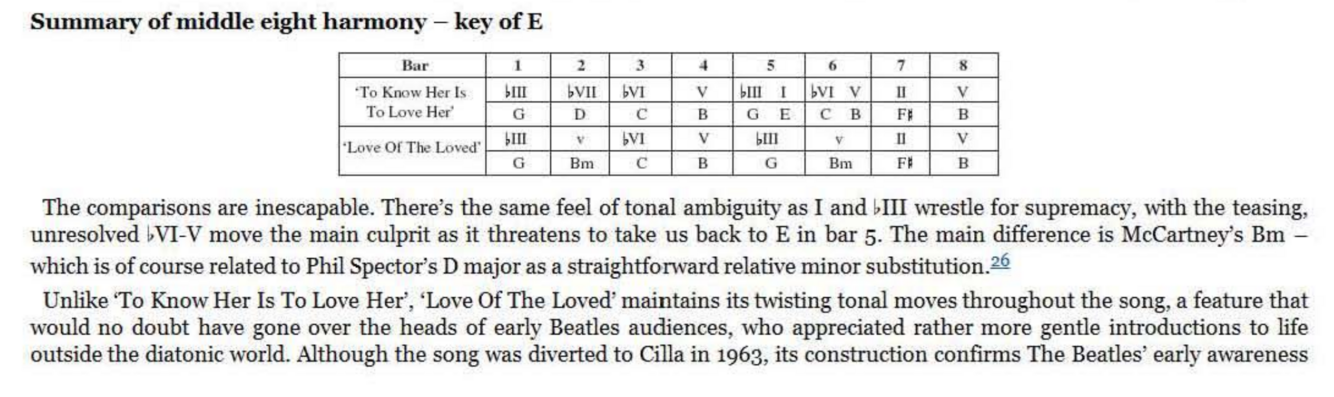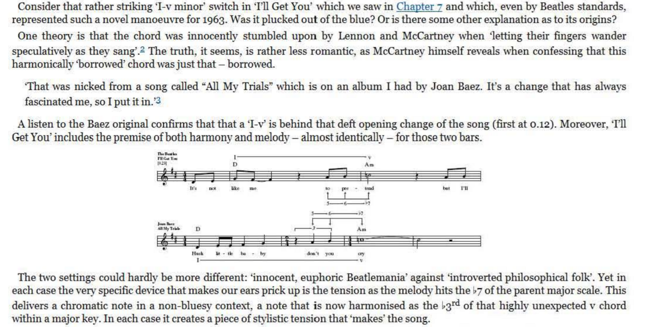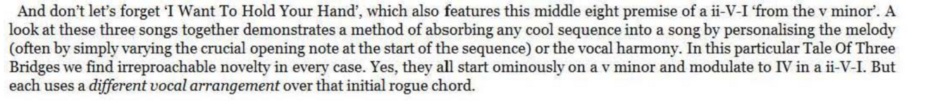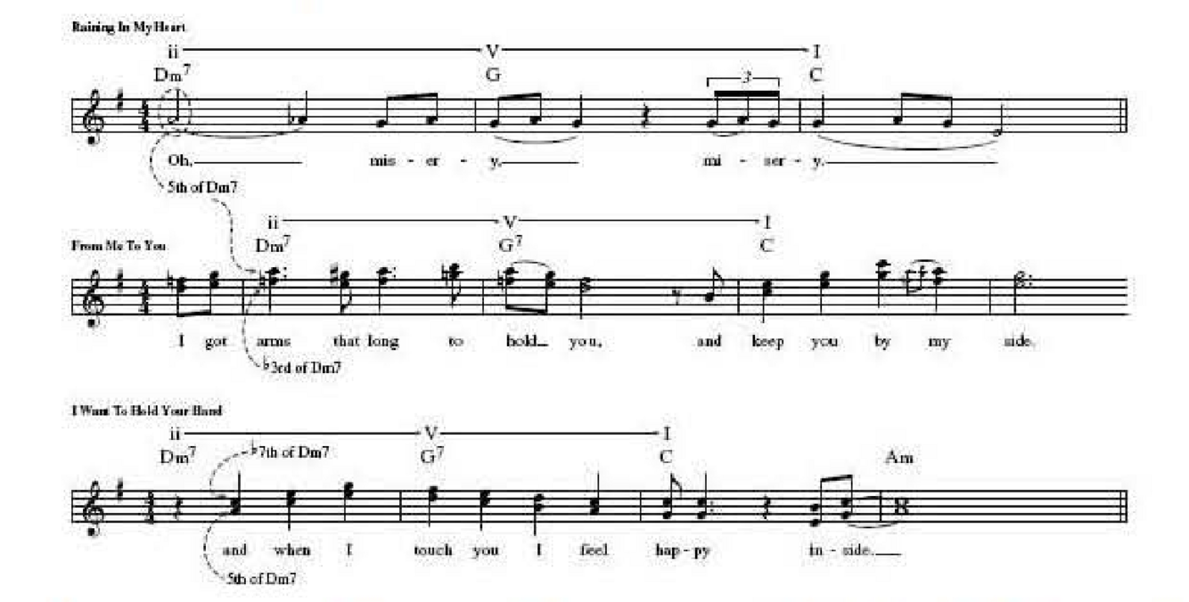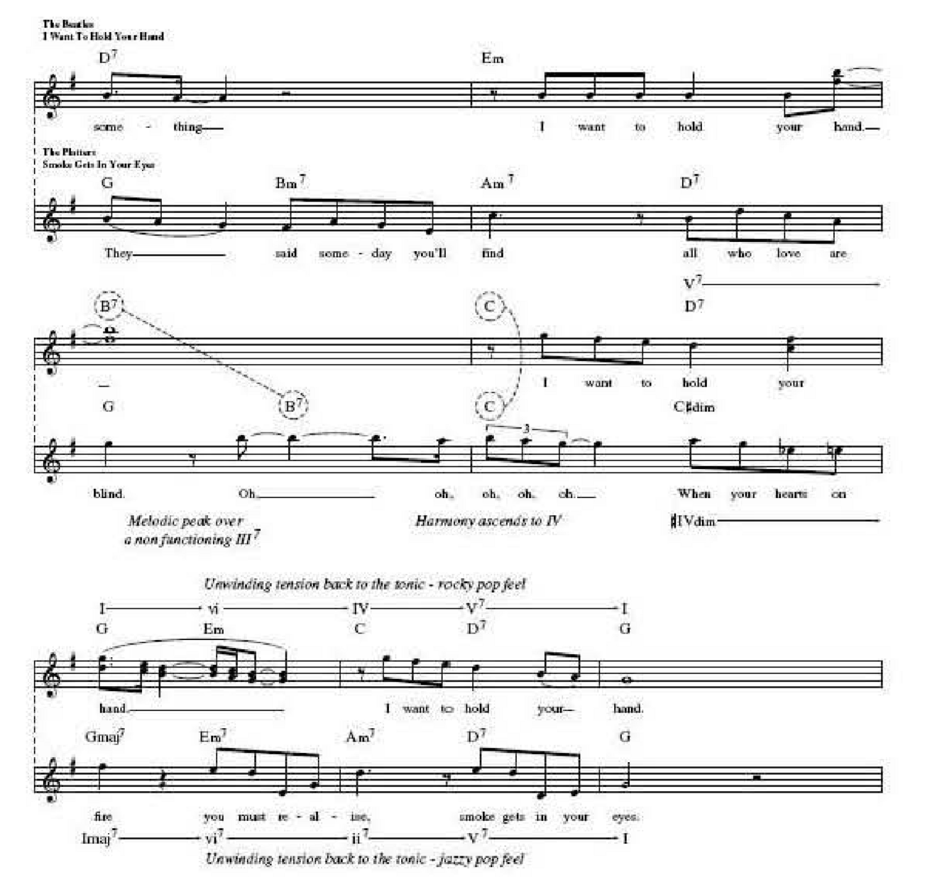 The Platters may have lacked cute Mop Tops and cool guitars but as with all these connections, cast aside your non -musical preconceptions for a moment. Forget the artists, the instrumentation and other textural issues and focus on the mechanics of the music. How does the song work? In both cases the secondary dominant harmonises the strong chord tone - not merely for a melodic peak but clearly as the moment of musical ecstasy in the song. It forms a watershed that separates the build- up of the opening bars and the winding-down that follows.