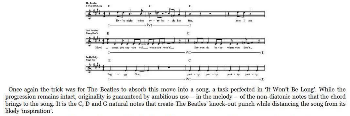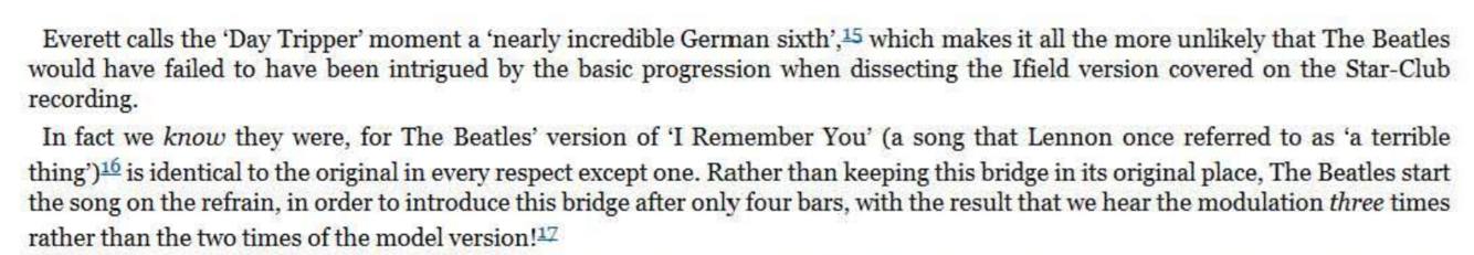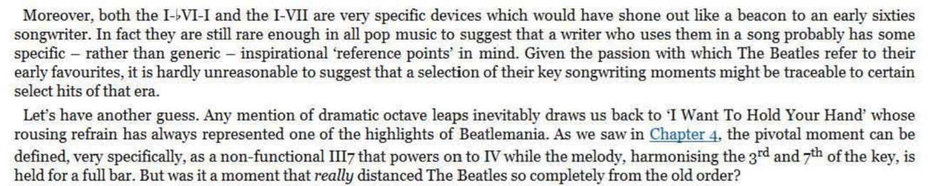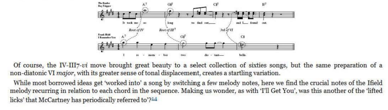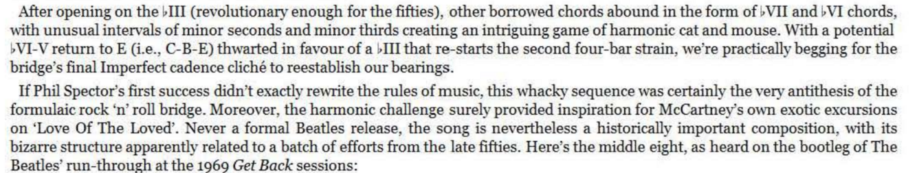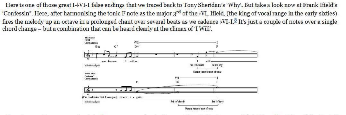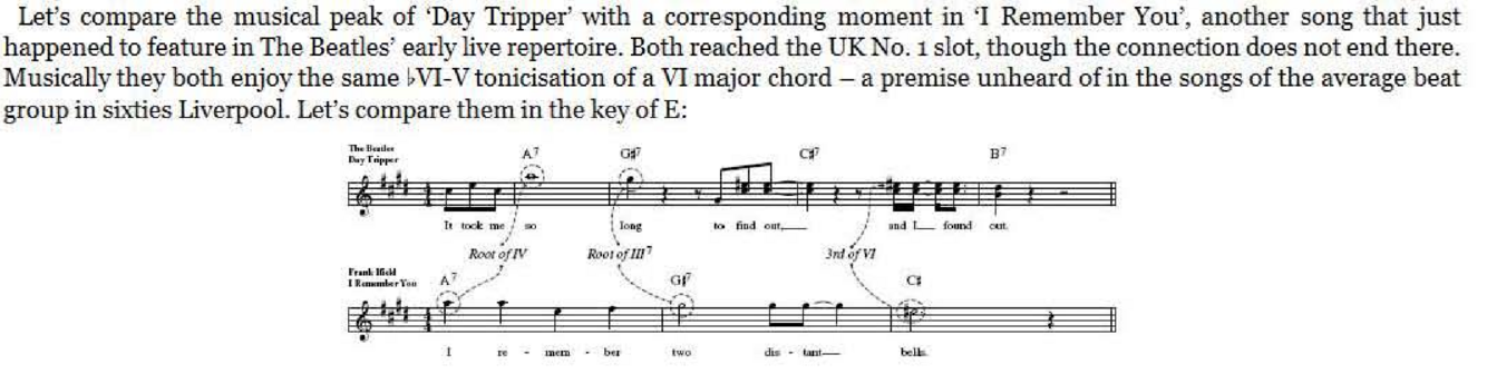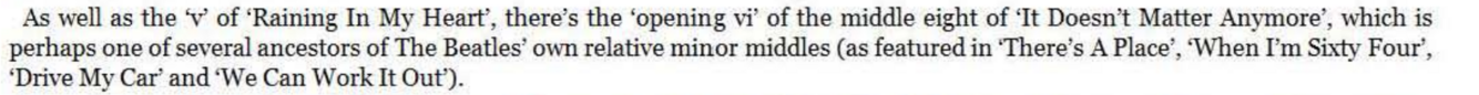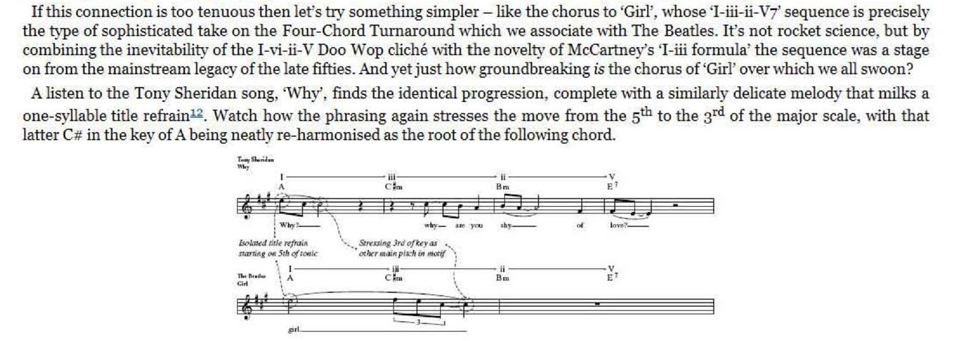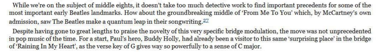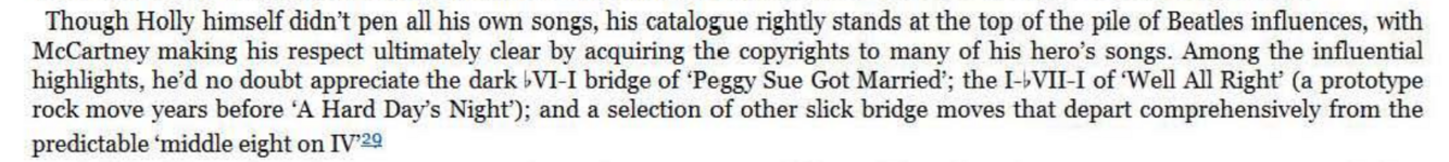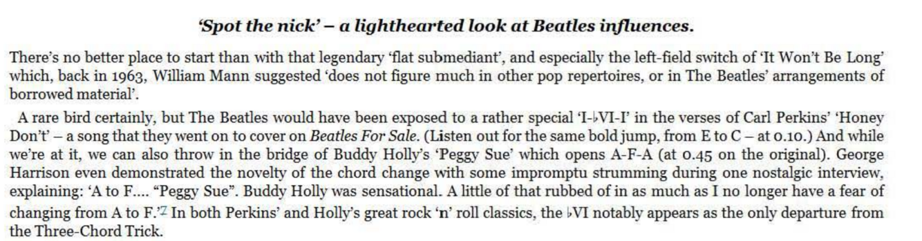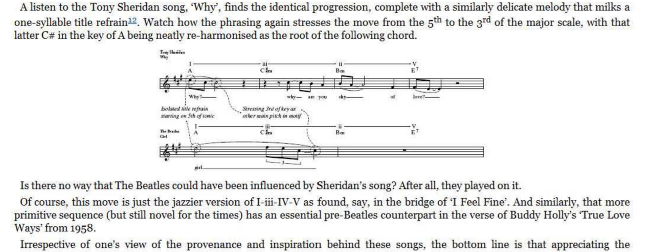 Is there no way that The Beatles could have been influenced by Sheridan’s song? After all, they played on it. Of course , this move is just the jazzier version of I-iii-IV-V as found in the bridge of ‘I Feel Fine’. And similarly, that more primitive sequence (but still novel for the times) has an essential pre -Beatles counterpart in the verse of Buddy Holly’s ‘True Love Ways’ from 1958.