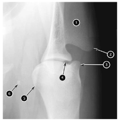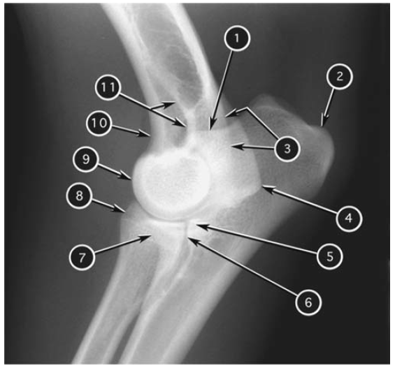 - Anconeal process of ulna (one on each radiograph)