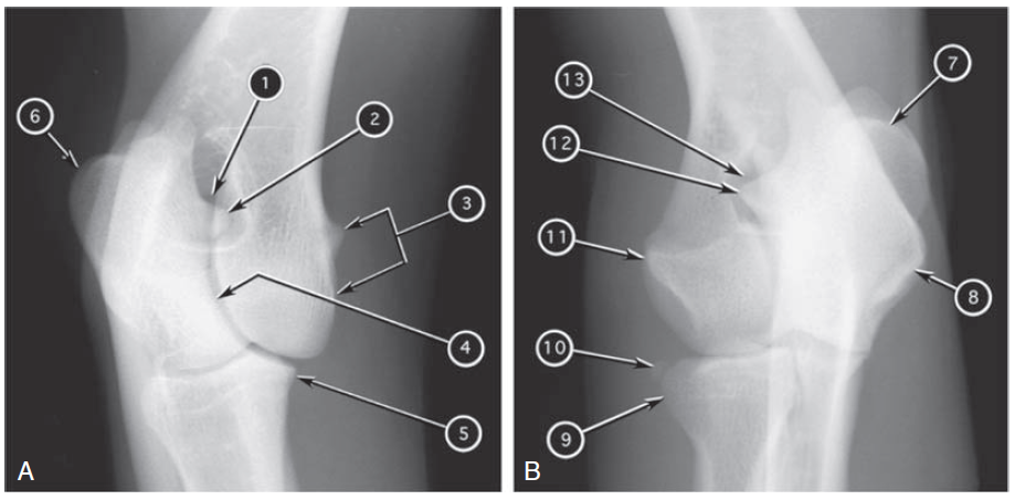 Craniolateral-caudomedial oblique (A) and craniomedial-caudolateral oblique (B) radiographs of canine elbow joint