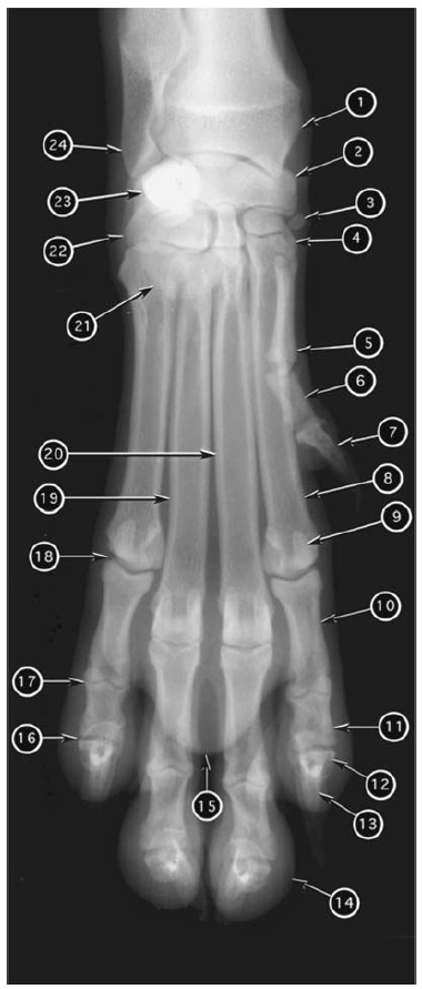 Dorsopalmar radiograph of canine manus