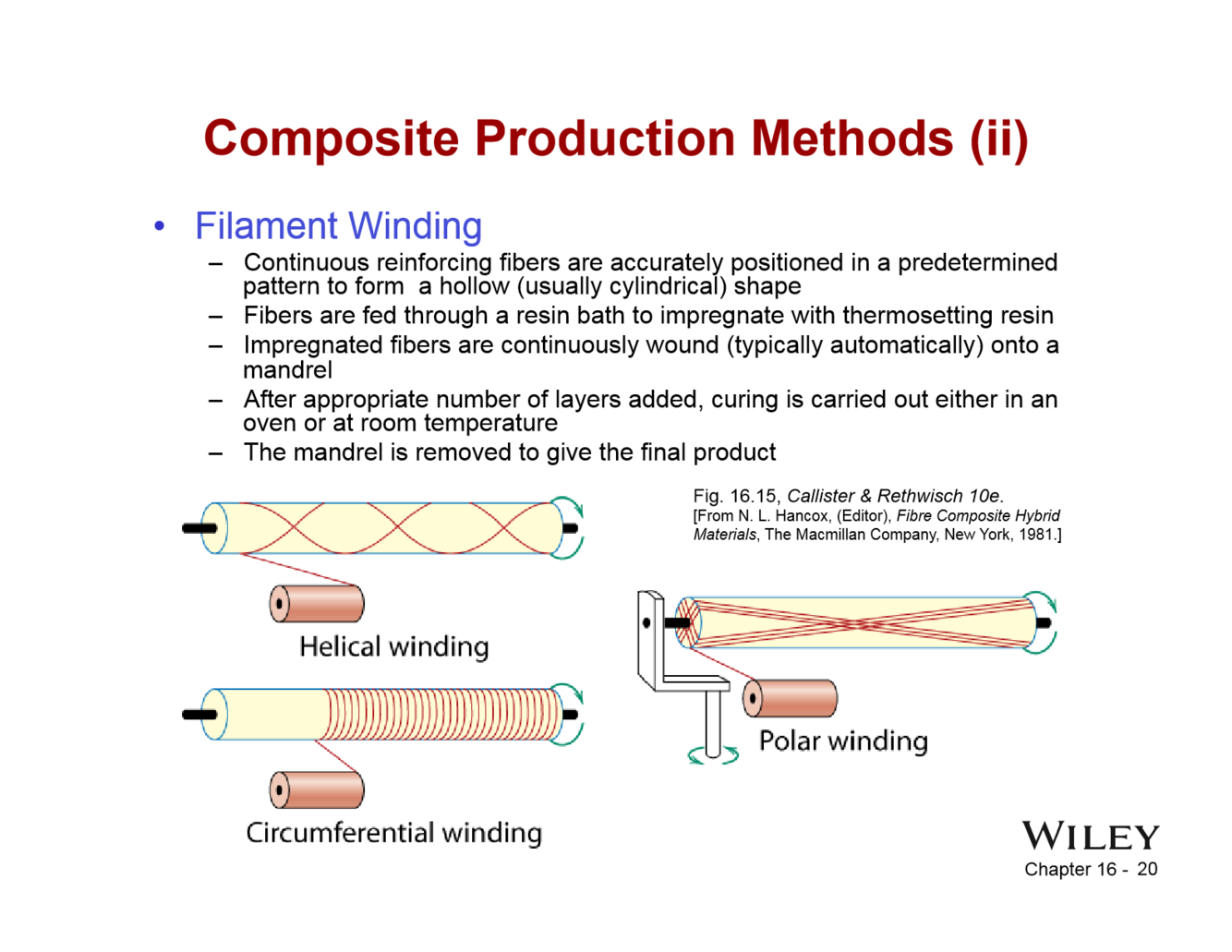 filament winding - is a fabrication technique mainly used for manufacturing open (cylinders) or closed end structures (pressure vessels or tanks).
