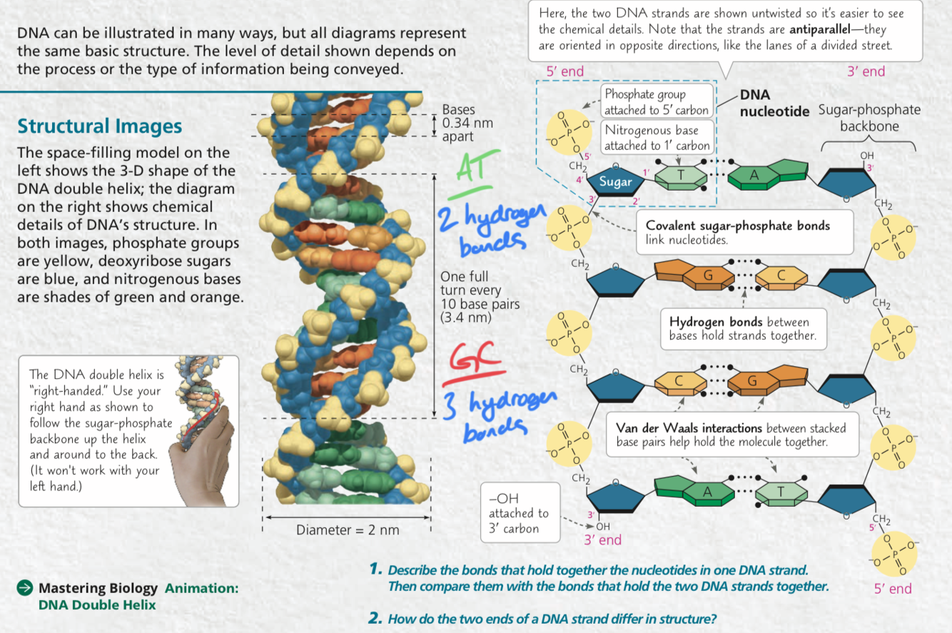 Helix makes one full turn every 3.4 nm along its length; every 10 base pairs