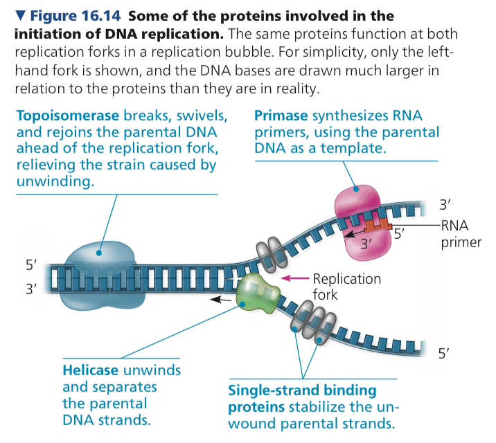 Helicases- enzymes that untwist the double helix at the replication forks separating the two parental strands