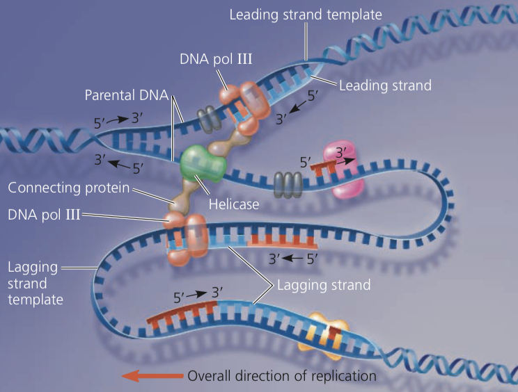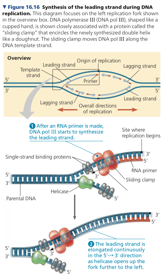 Along the leading strand DNA polymerase can sythesize a complementary strand continuously in the required 3’ → 5’ direction towards the replication fork as it progresses