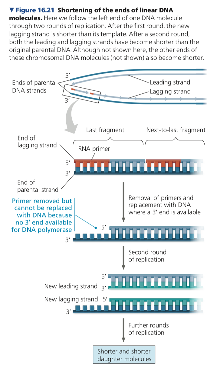 The usual replication machinery provides no way to complete the 5′ ends because there is no preexisting 3’ end for DNA polymerase to add on to