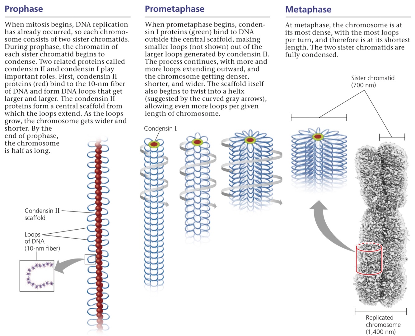 Condensin II (red) binds to the 10 nm chromatin fiber in prophase and forms loops that get larger and larger; form a central scaffold from which the loops extend