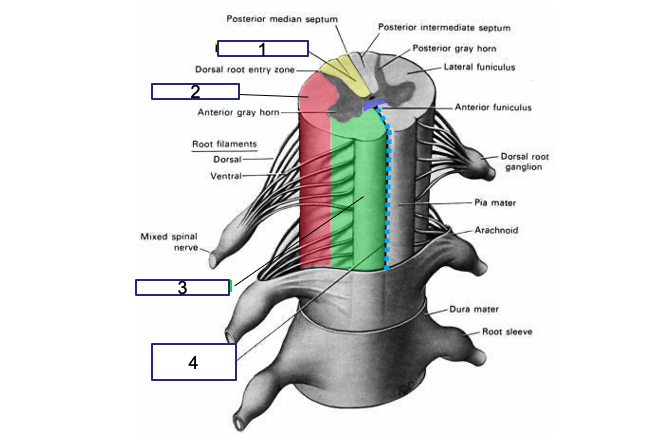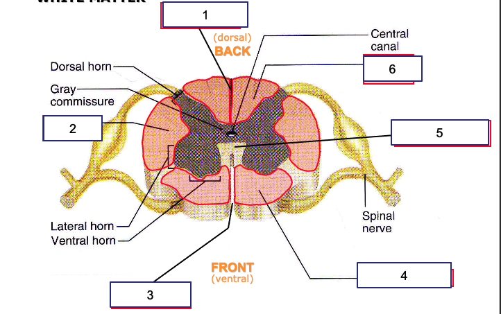This picture is concerned with the white matter of the spinal cord. Identify 1-6