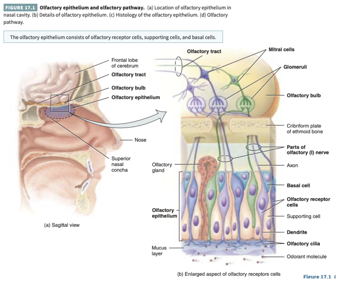 Are the first-order neurons of the olfactory pathway. Are bipolar neurons with an exposed, knob-shaped dendrite and an axon projecting through the cribriform plate that ends in the olfactory bulb.