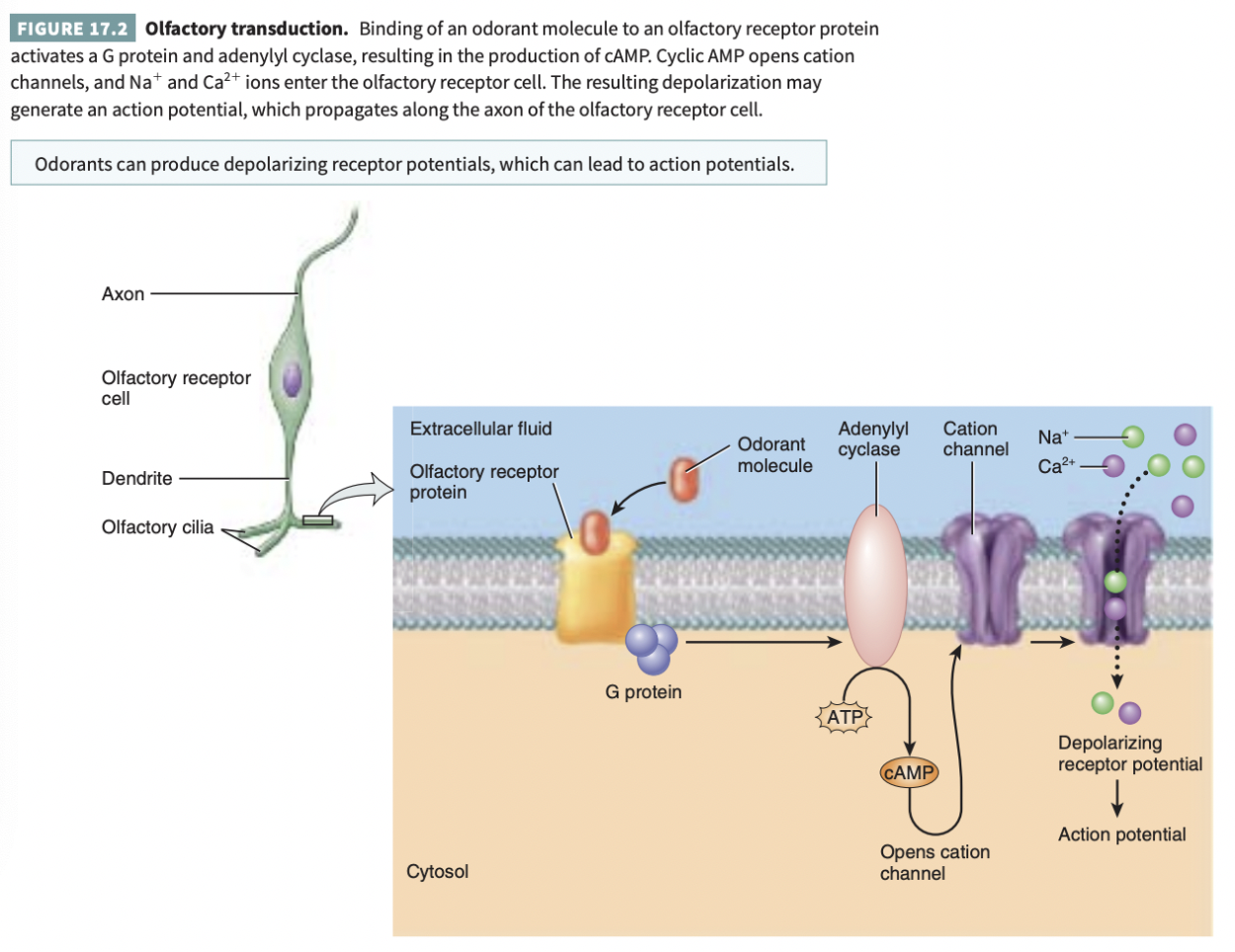 Binding of an odorant molecule to an olfactory receptor protein activates a G protein and adenylyl cyclase, resulting in the production of cyclic AMP (cAMP). Cyclic AMP (cAMP) opens cation channels, and Na+ and Ca2+ ions enter the olfactory receptor cell. The resulting depolarization may generate an action potential, which propagates along the axon of the olfactory receptor cell.