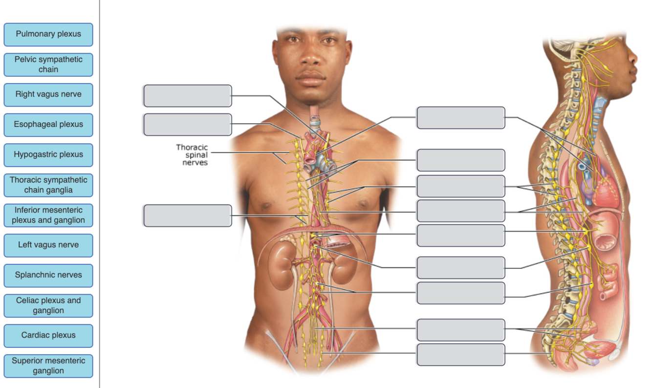 Sympathetic preganglionic neurons synapse with postganglionic neurons in all of the following EXCEPT __________. terminal ganglia. celiac ganglia. inferior mesenteric ganglia. chain ganglia. cervical ganglia.