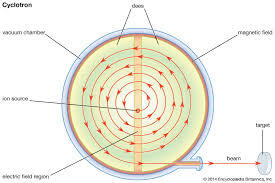 Particles spiral outward between two ‘dees’ under a magnetic field, gaining energy each pass until exiting to hit a target.
