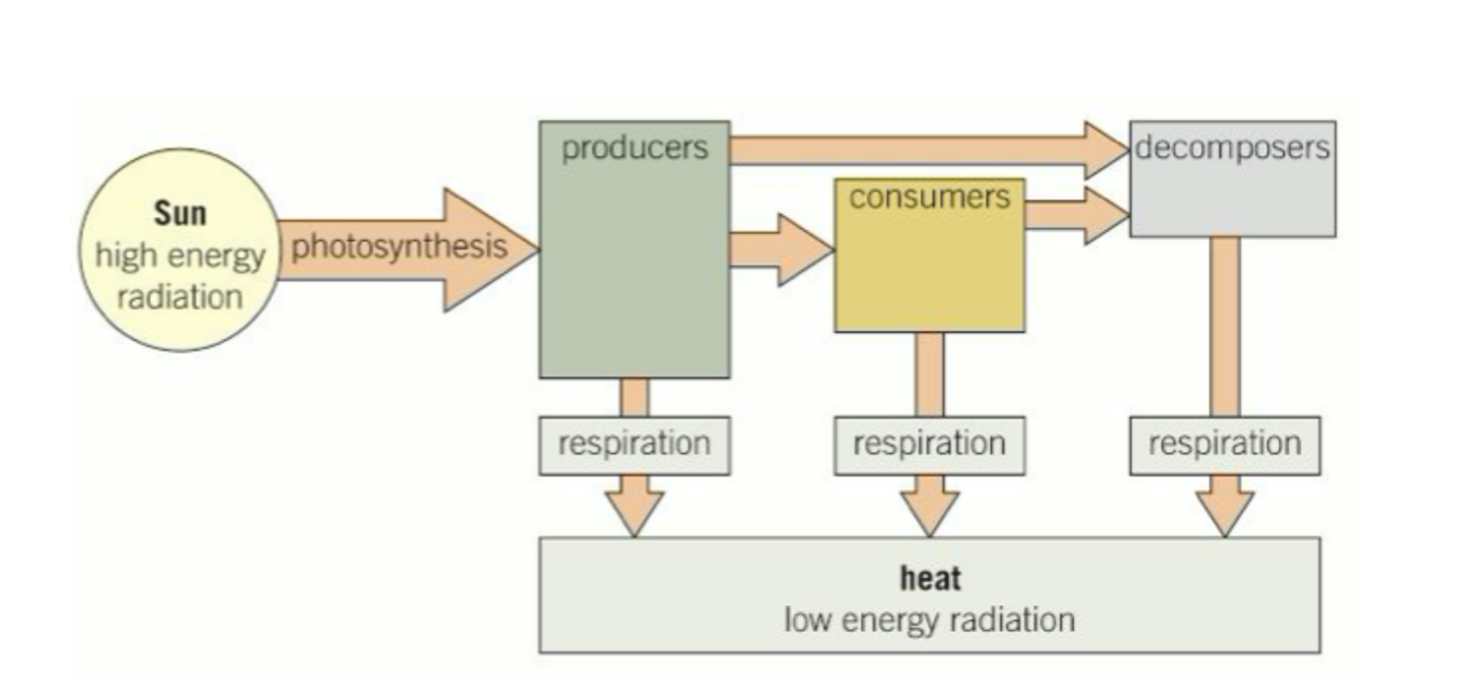 Radiation from the Sun is used to fuel the metabolic reactions and processes necessary to keep organisms alive before, eventually, being transferred back to the atmosphere as heat