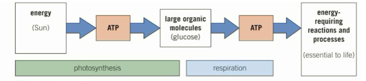 In respiration organic molecules, such as glucose, are broken down and the energy released is used to synthesise ATP.