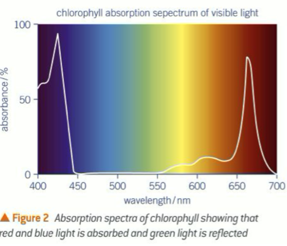 absorbs mainly red and blue light and reflects green light.