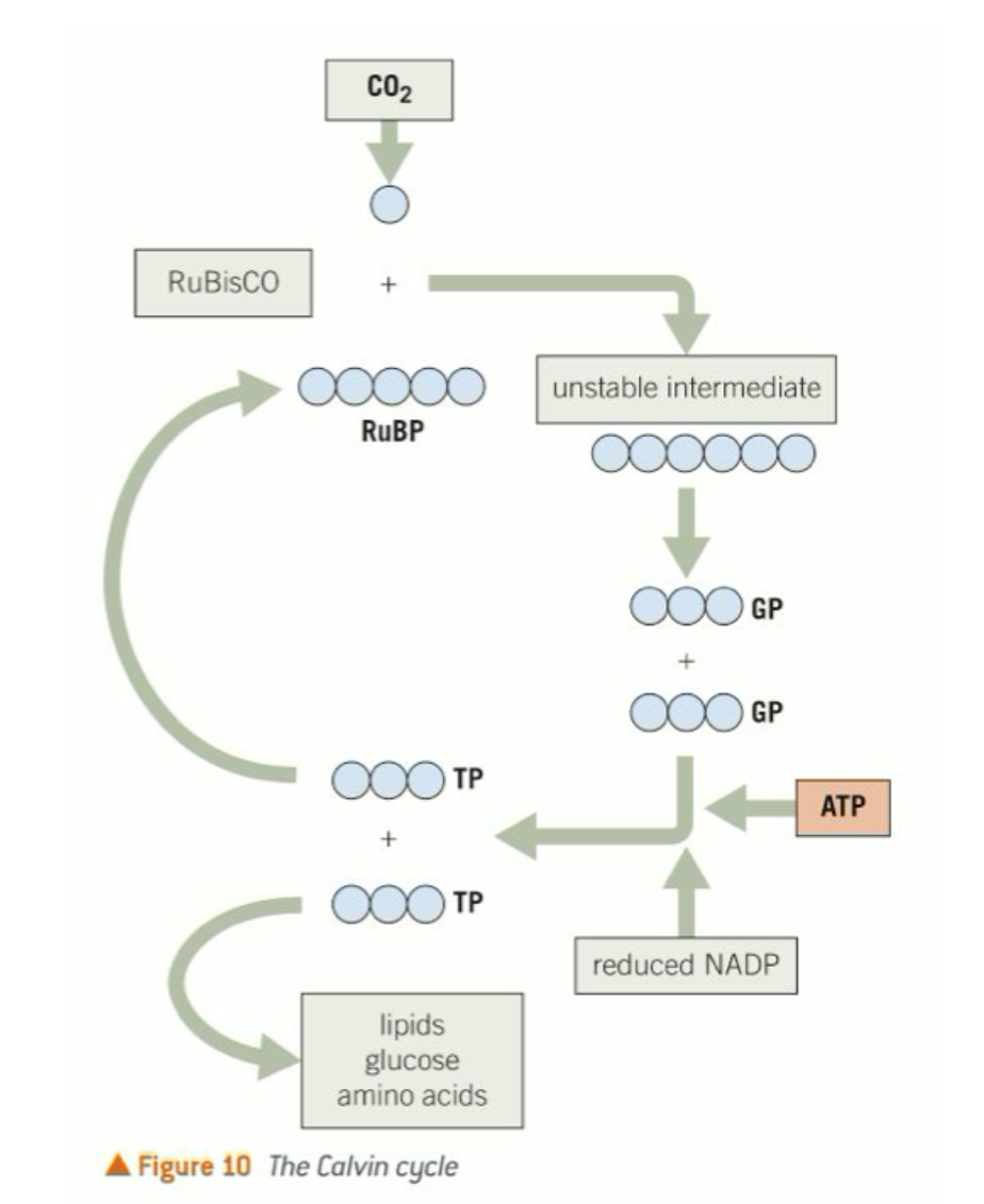 10 x three-carbon TP = 30 carbons ‘shuffled’ gives 6 x five-carbon RuBP = 30 carbons