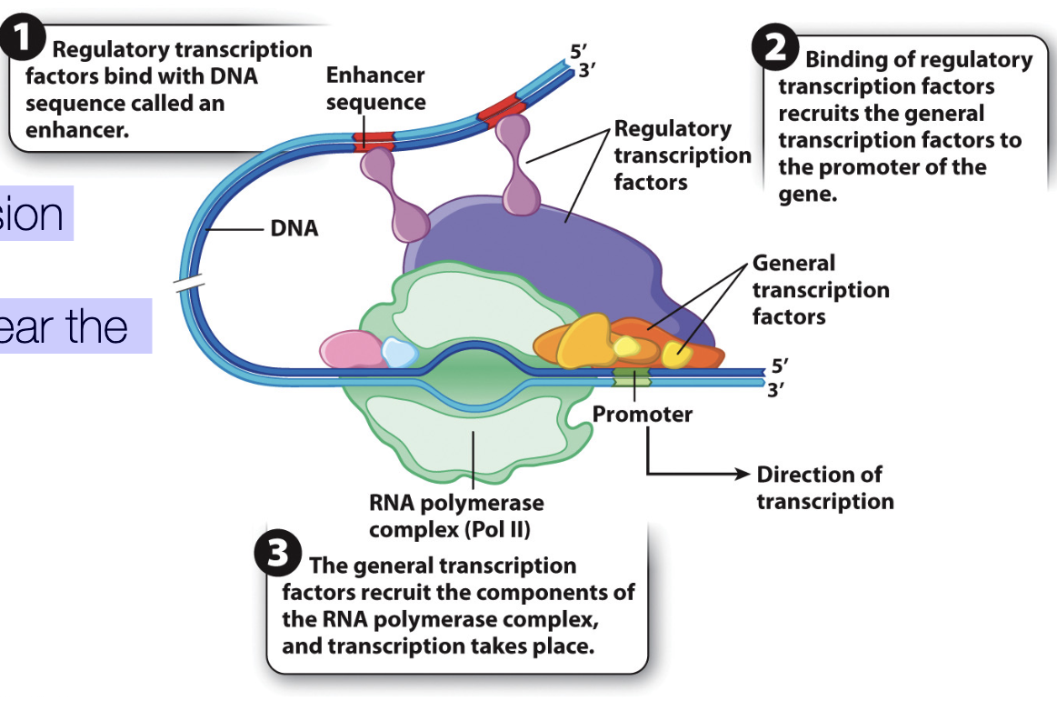 •Enhancers bind at enhancer sequences near the