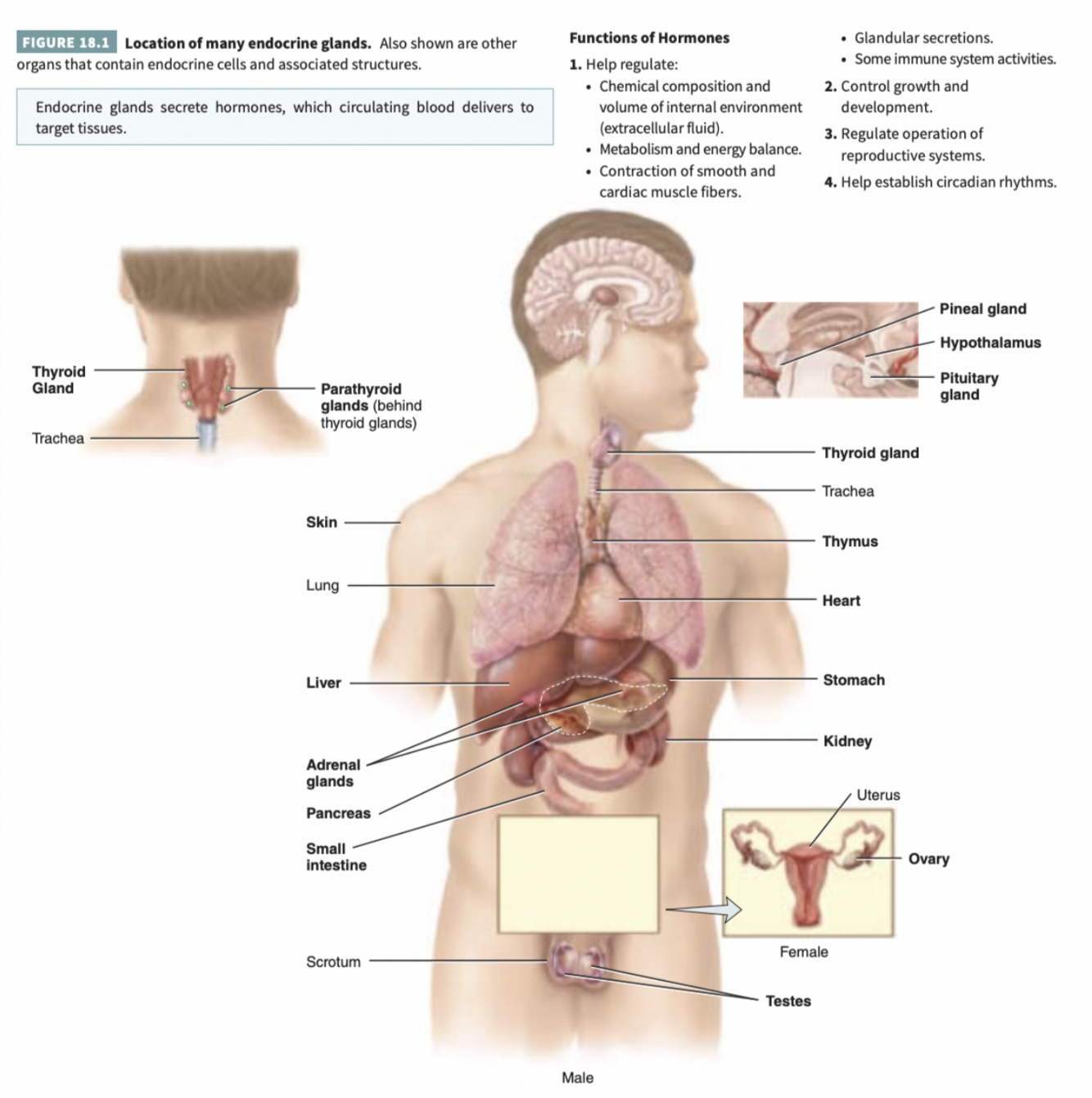 All endocrine glands and hormone-secreting cells. Include the hypothalamus, thymus, pancreas, ovaries, testes, kidneys, stomach, liver, small intestine, skin, heart, adipose tissue, and placenta.