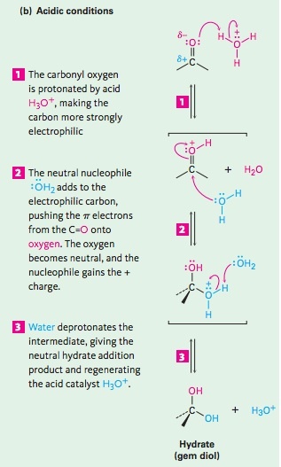 What is the mechanism for nucelophilic addition under acidic conditions?