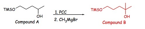 Compound A is oxidized using PCC and then reacted with methyl magnesium bromide,