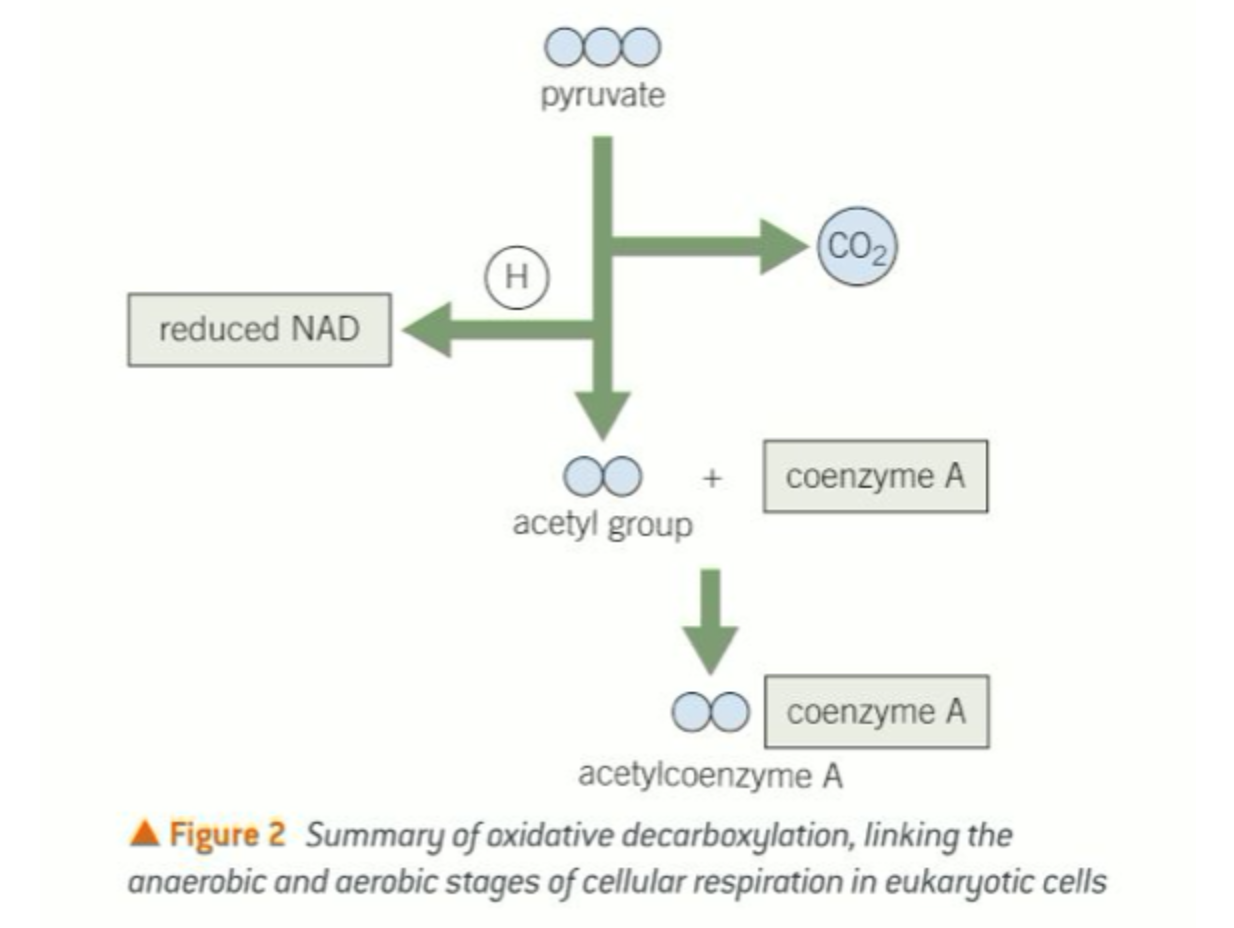 This is sometimes referred to as the link reaction, because it is the step that links anaerobic glycolysis, occurring in the cytoplasm, to the aerobic steps of respiration, occurring in the mitochondria.