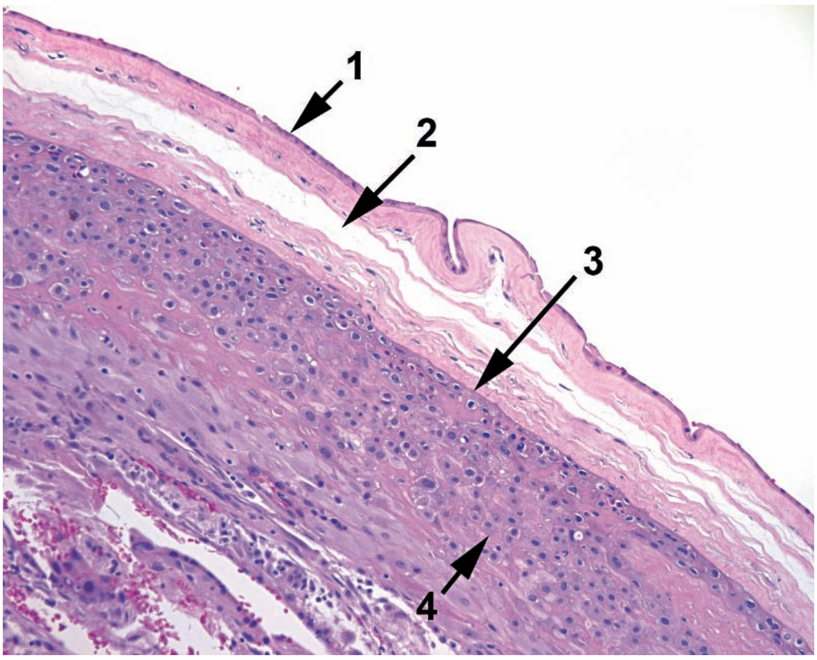 Necrotizing chorioamnionitis: Sheets of neutrophils, thickened amnionic basement membrane, and necrotic amnion.