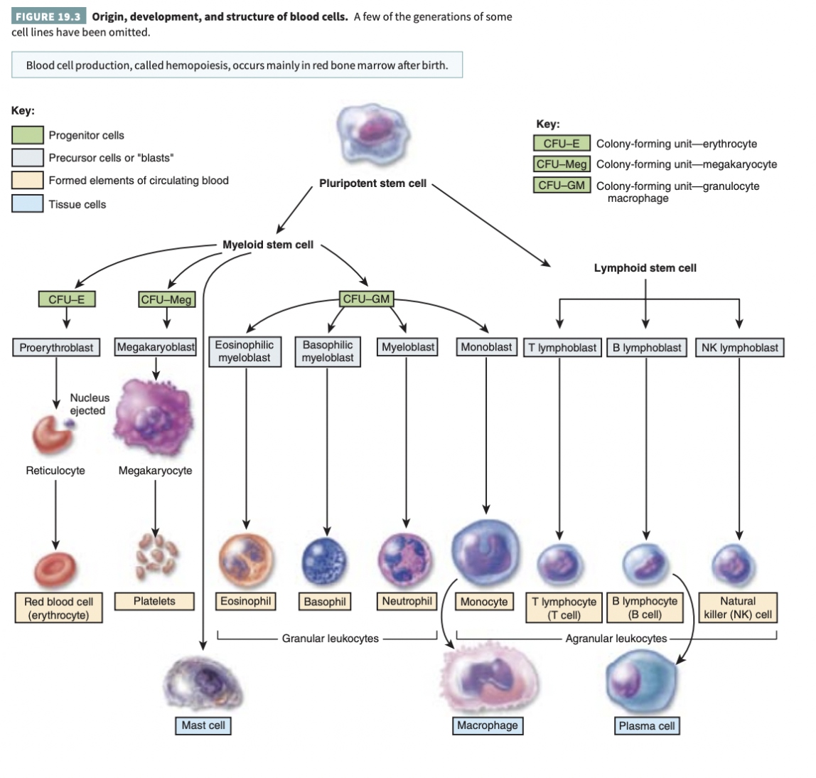 Begin their development in red bone marrow and give rise to red blood cells, platelets, monocytes, neutrophils, eosinophils, basophils, and mast cells.