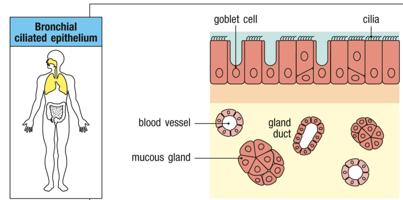 Airways lined by cilia. Beating moves stream of mucus secreted by goblet cells