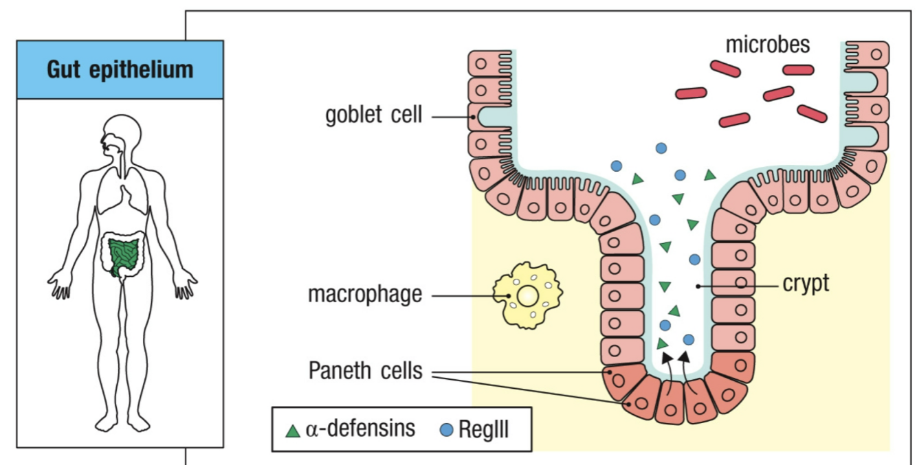 The gut epithelium contains ______ cells that are deep in the epithelial crypts and produce antimicrobial defensins + the lectin RegIII