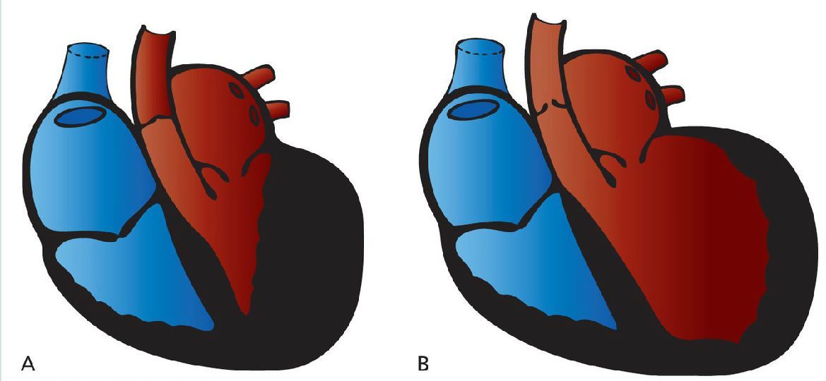 (A) A hypertrophied left ventricle caused by aortic stenosis. The wall is so thick that the chamber size is actually diminished. “concentric hypertropy”. (B) An enlarged left ventricle. The chamber is bigger, but the wall thickness is normal. “encentric hypertropy”