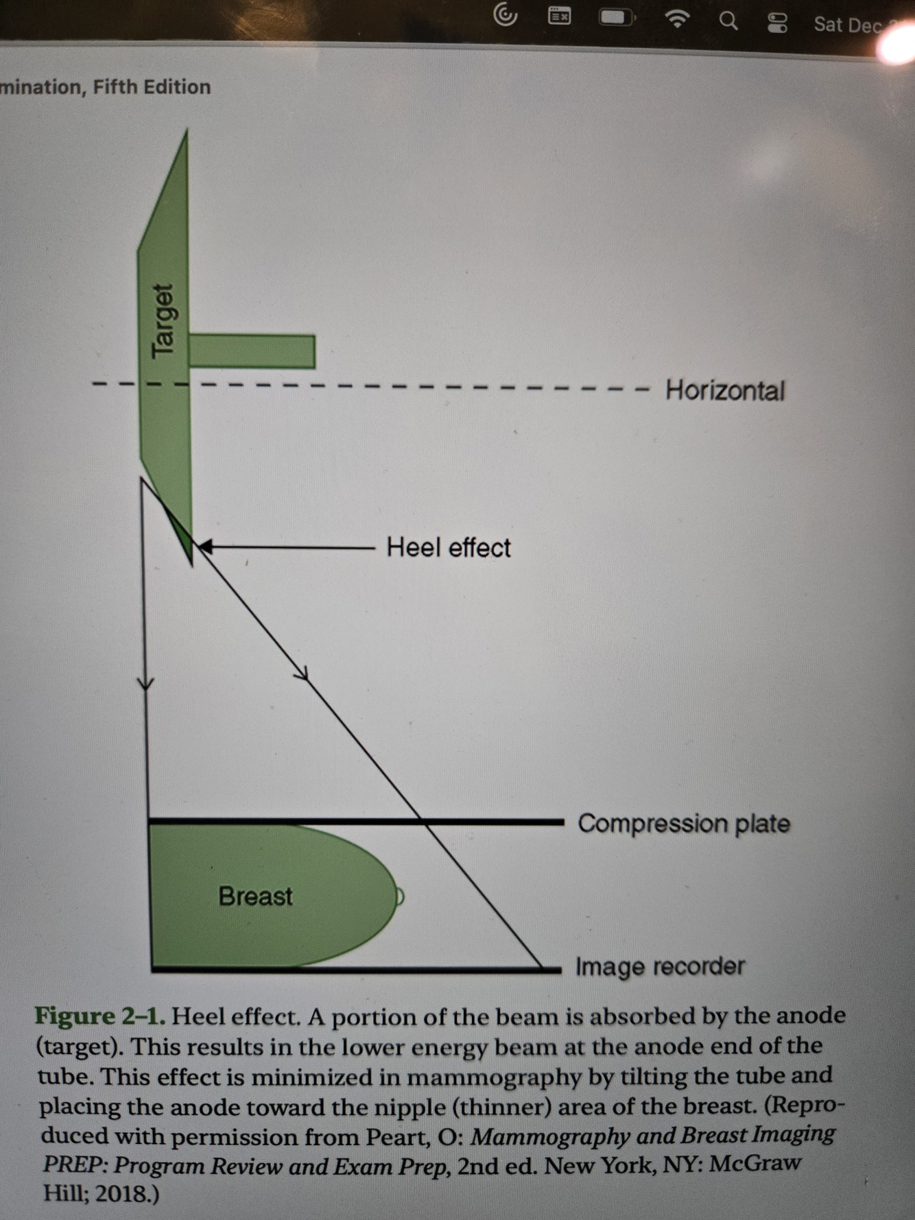“(C) The heel of the anode reduces the intensity of the x-ray beam only on the anode side. When comparing the beam intensity on the cathode side with the anode side, the intensity on the cathode side will be higher. To compensate for this varying intensity, the mammography tube is turned to position the thickest portion of the breast (posterior) at the cathode end of the tube. In general, the smaller the anode angle, the larger is the heel effect because there is an increased absorption of the rays (Fig. 2–1).”