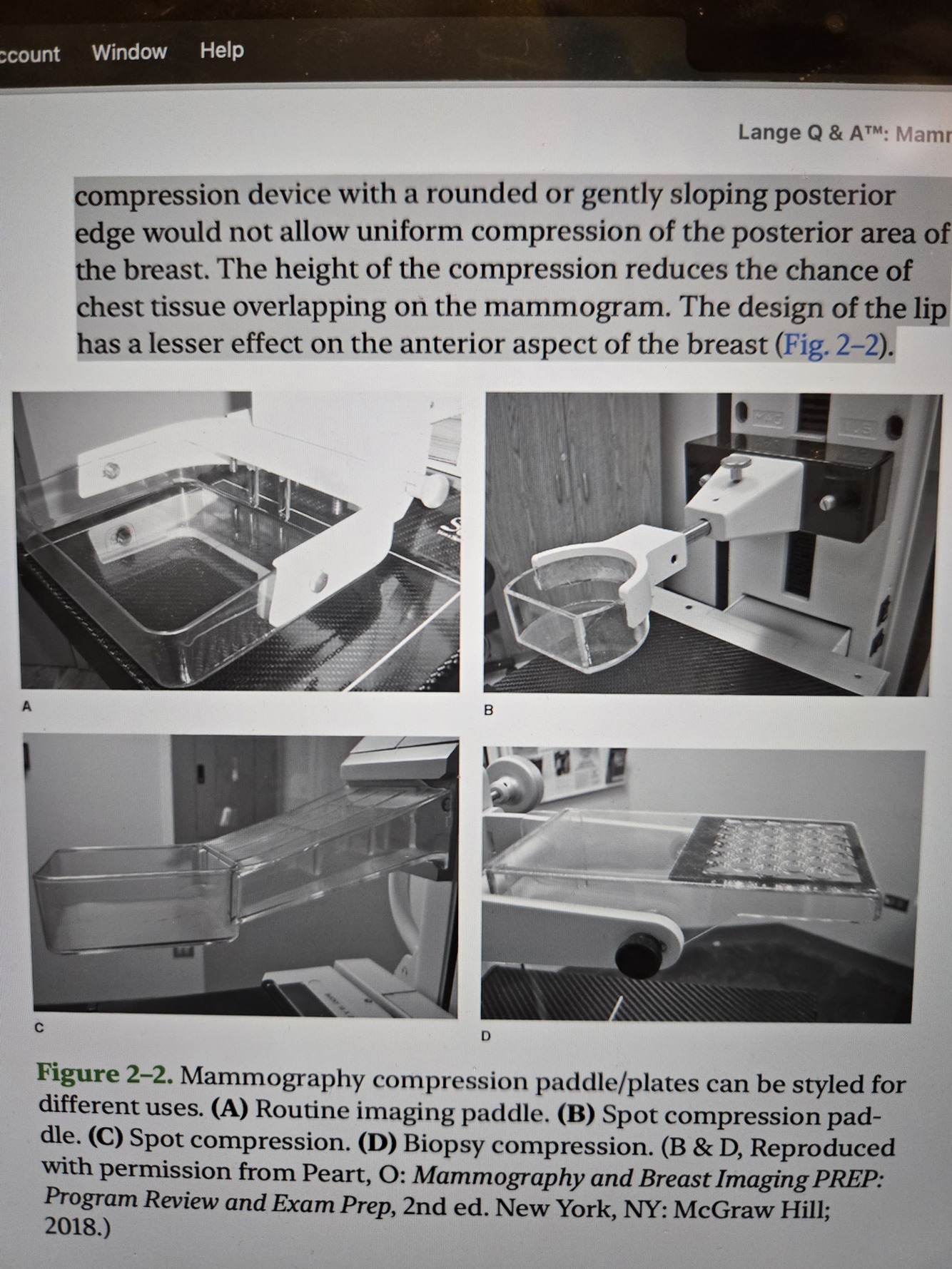 “(D) Both the height and angle of the compression paddle make a difference in the final image, and the overall design is considered to increase the structural strength of the compression paddle. A compression device with a rounded or gently sloping posterior edge would not allow uniform compression of the posterior area of the breast. The height of the compression reduces the chance of chest tissue overlapping on the mammogram. The design of the lip has a lesser effect on the anterior aspect of the breast (Fig. 2–2).”