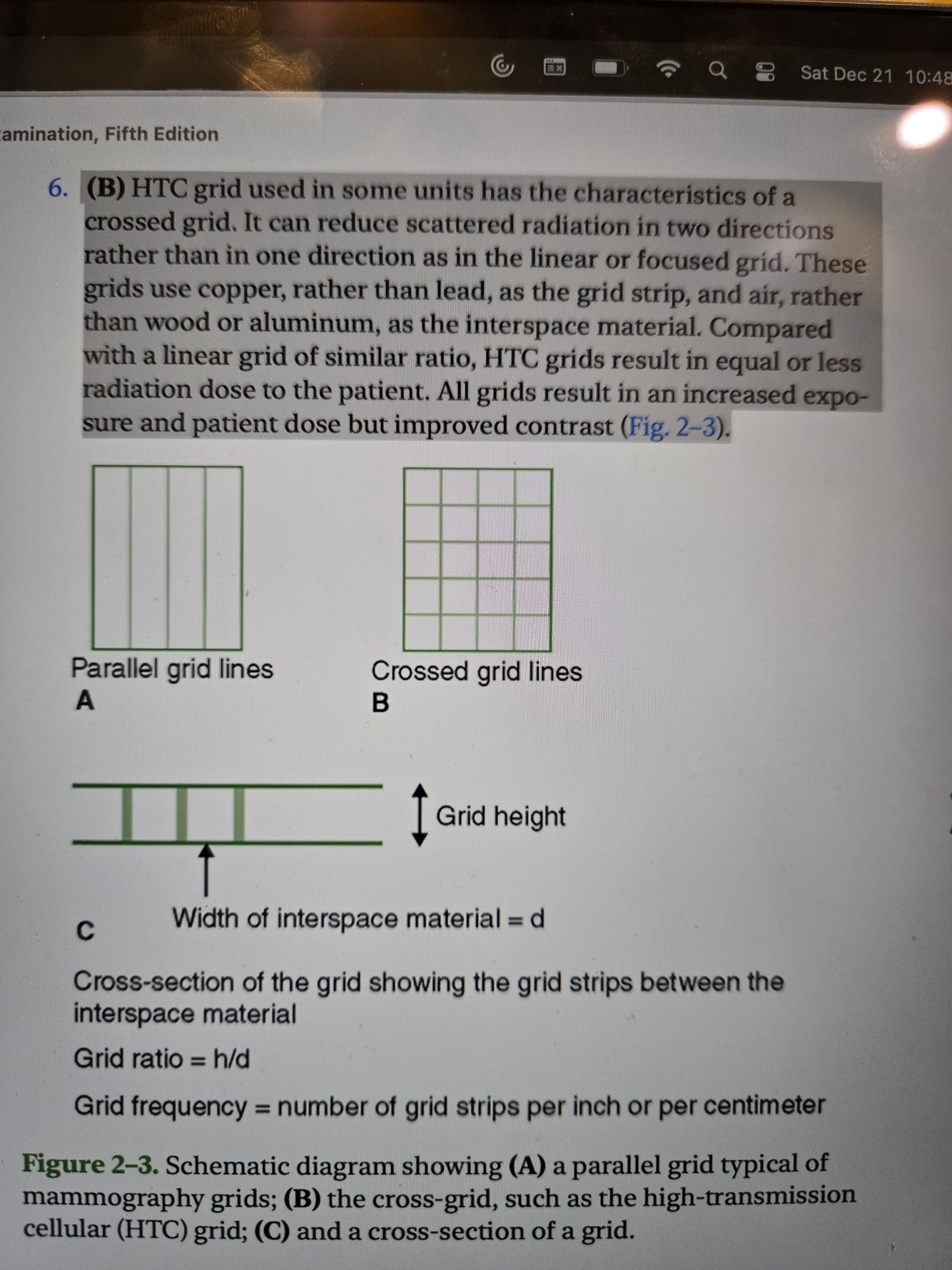 “(B) HTC grid used in some units has the characteristics of a crossed grid. It can reduce scattered radiation in two directions rather than in one direction as in the linear or focused grid. These grids use copper, rather than lead, as the grid strip, and air, rather than wood or aluminum, as the interspace material. Compared with a linear grid of similar ratio, HTC grids result in equal or less radiation dose to the patient. All grids result in an increased exposure and patient dose but improved contrast (Fig. 2–3).”
