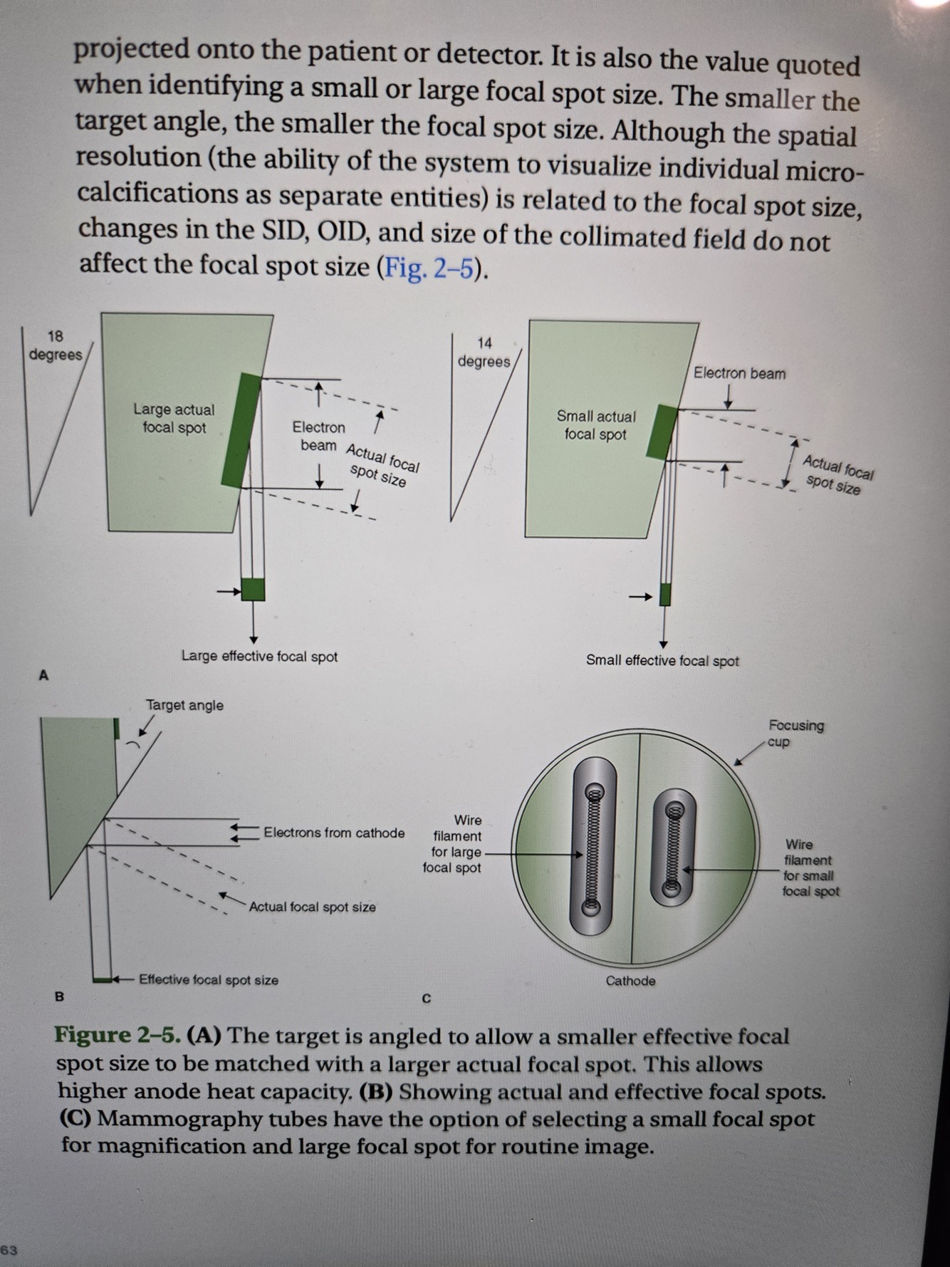 “(A) The focal spot is the area where electrons strike on the target. In the design based on the line-focus principle, the target is angled allowing a larger area for the electrons to strike while maintaining a small, effective focal spot size. The effective focal spot is the area projected onto the patient or detector. It is also the value quoted when identifying a small or large focal spot size. The smaller the target angle, the smaller the focal spot size. Although the spatial resolution (the ability of the system to visualize individual microcalcifications as separate entities) is related to the focal spot size, changes in the SID, OID, and size of the collimated field do not affect the focal spot size (Fig. 2–5).”