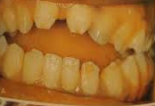 Wear of teeth due to attrition and abrasion. IE chewing tobacco.