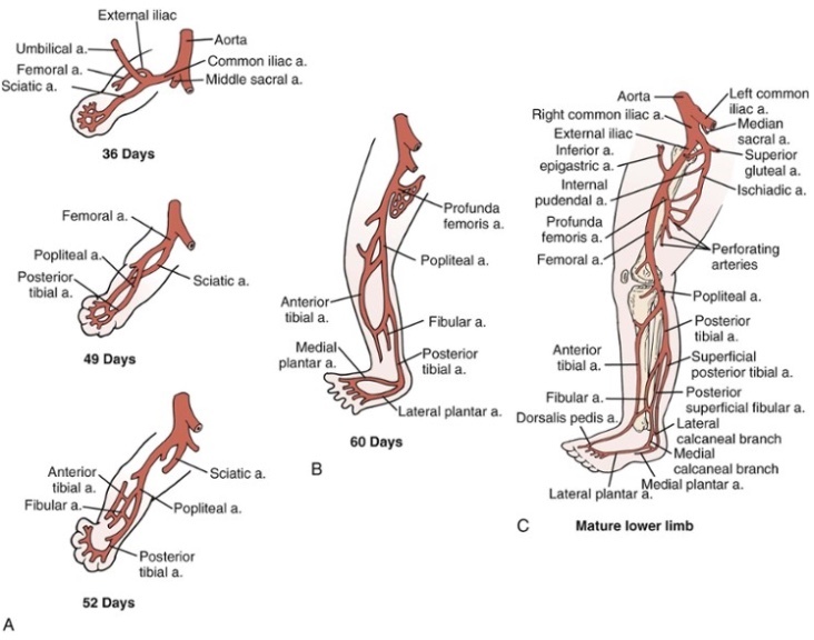 Axial artery regress (8th week) but parts persist as sciatic (ischiadic) artery, popliteal artery and peroneal artery