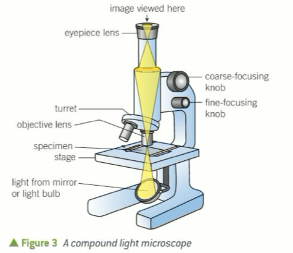 A compound light microscope has two lenses - the objective lens, which is placed near to the specimen, and an eyepiece lens, through which the specimen is viewed.
