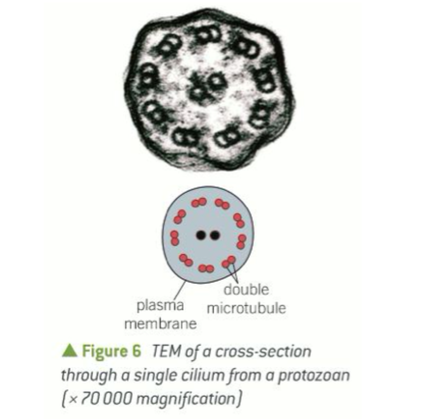 Each cilium contains two central microtubules (black circles) surrounded by nine pairs of microtubules arranged like a “wheel”. This is known as the 9+2 arrangement (Figure 6).