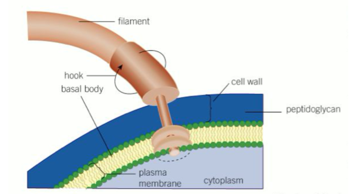 A molecular motor causes the hook to rotate giving the filament a whip-like movement, which propels the cell.