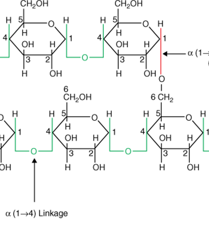 linearly between carbon 1 and carbon 4 and as branches between crabons 1 and 6.