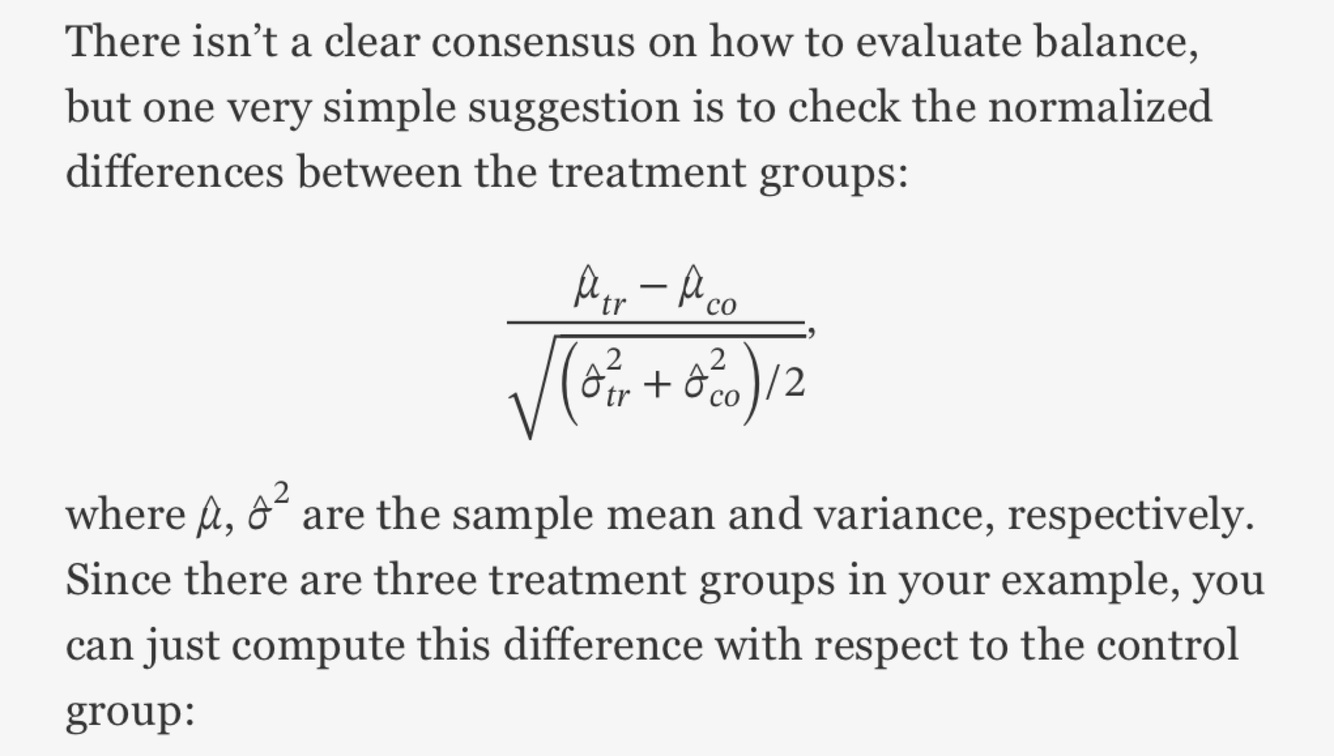What is a simple measure for difference between control and treatment groups with respect to pre-treatment characteristics?