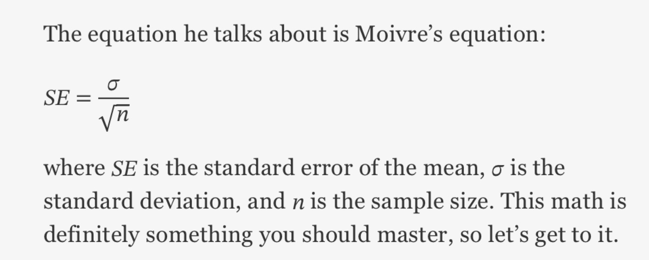Moivre’s equation states the formula for calculating the standard error of a mean.