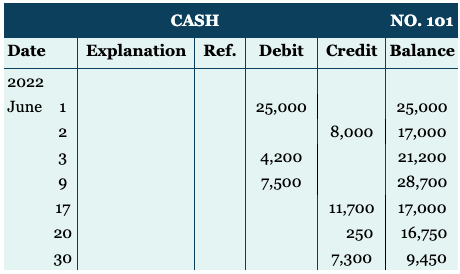 A form with columns for debit, credit, and balance amounts in an account