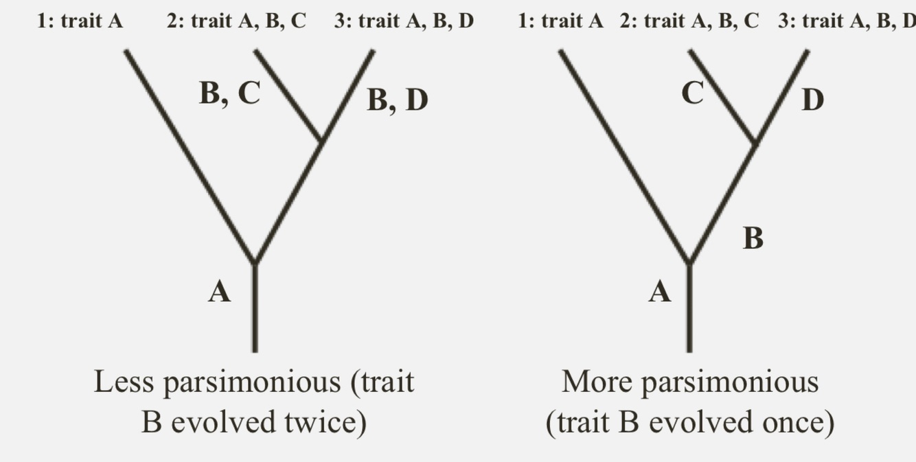 In regards to phylogenetic trees, choose the simplest cladogram with the fewest steps or events