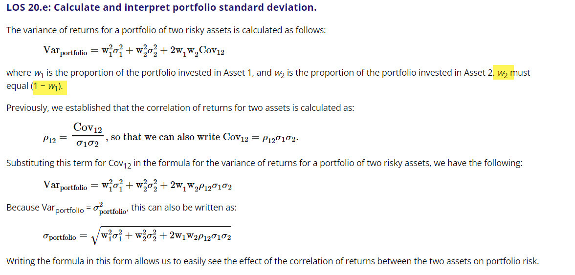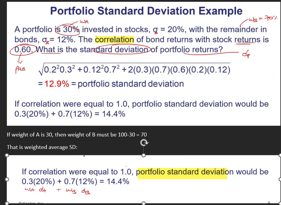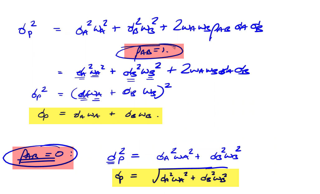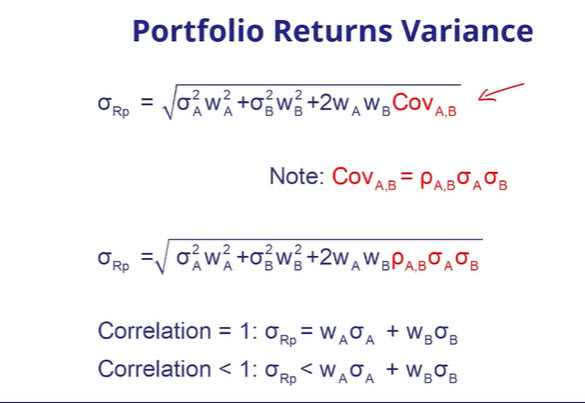 whereas perfect negative correlation (r = -1) offers the greatest risk reduction…. Corr lower than 1 you get some diversification benefit. Where our SD of portfolio will be less than the weighted SD of two assets together.
